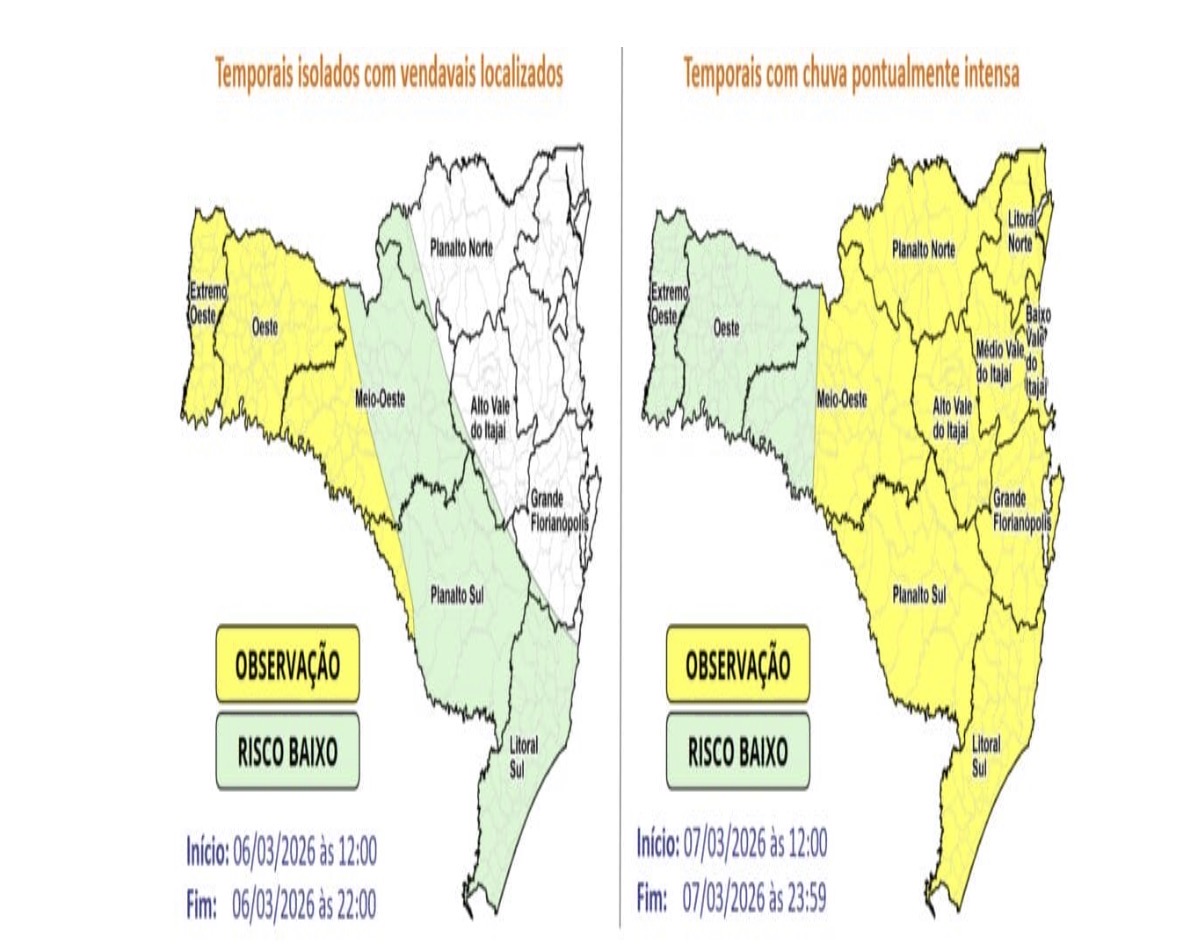 Defesa Civil alerta para temporais em Santa Catarina entre sexta e sábado