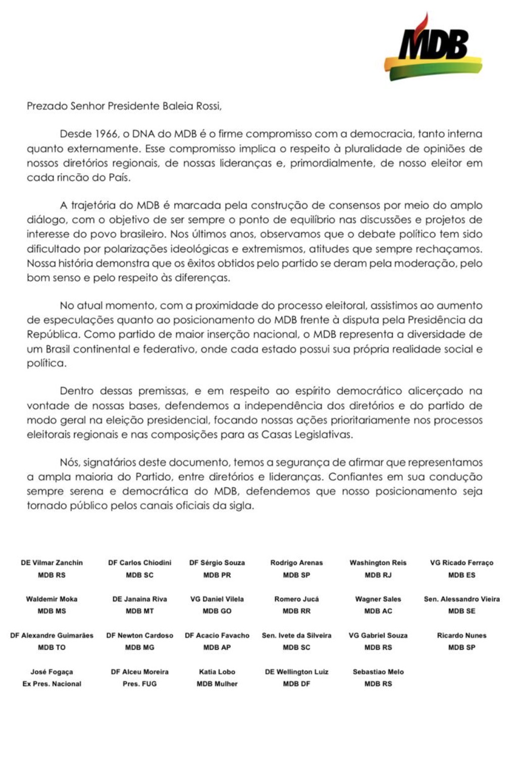 “Como partido de maior inserção nacional, o MDB representa a diversidade de um Brasil continental e federativo, onde cada estado possui sua própria realidade social e política”, afirma um dos trechos do manifesto.