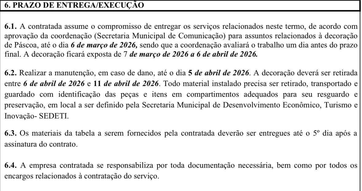 Cabe ressaltar que boa parte das estruturas utilizadas na decoração não é nova. O próprio Termo de Referência prevê a reutilização de diversos elementos adquiridos em anos anteriores, inclusive itens utilizados em decorações de Natal e Páscoa, que deveriam apenas passar por manutenção, limpeza ou pequenos reparos antes de serem reinstalados.